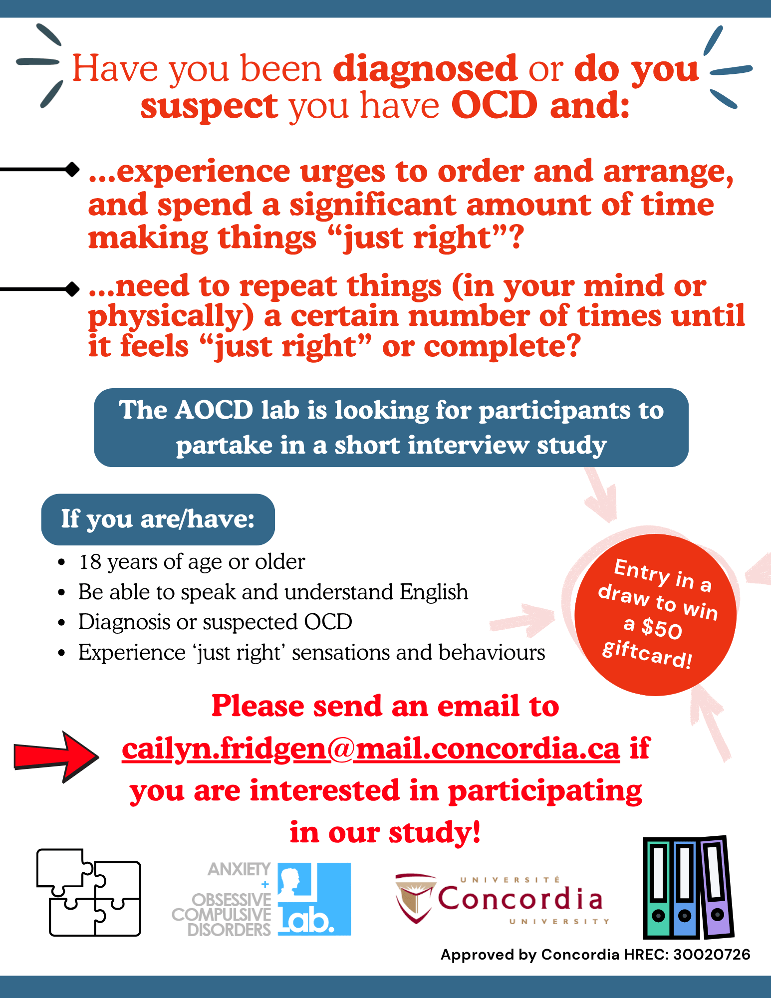 Our friends at the Anxiety and OCD Laboratory at Concordia University in Canada are conducting research to get to the heart of ‘just right’/incompleteness related symptoms in OCD.