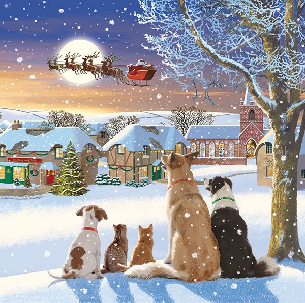 The illustration depicts three dogs and two cats standing next to a snow covered tree and looking up at Santa and eight reindeer flying above a snow covered village.