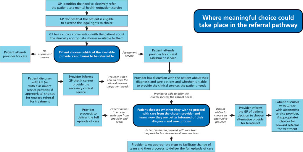 In April 2014, the then coalition government established legal rights so that patients in England have choice in mental health treatment as part of the drive to achieve parity with physical health. The legal rights cover: