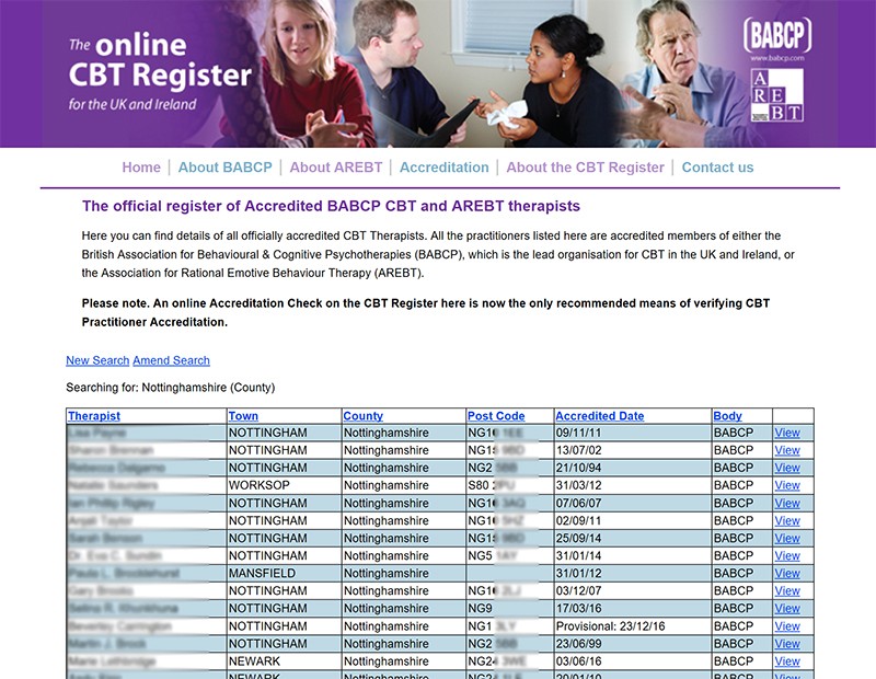 When you search the BABCP register, simply select your region from the ‘Geographical Search’ drop down menu and then click search. You will then be presented with a list of names, showing their locations and accreditation dates. You can then click against each name for their full contact information. A recently accredited date does not indicate any less experience, it just means they have only recently chosen to become accredited with the BABCP.