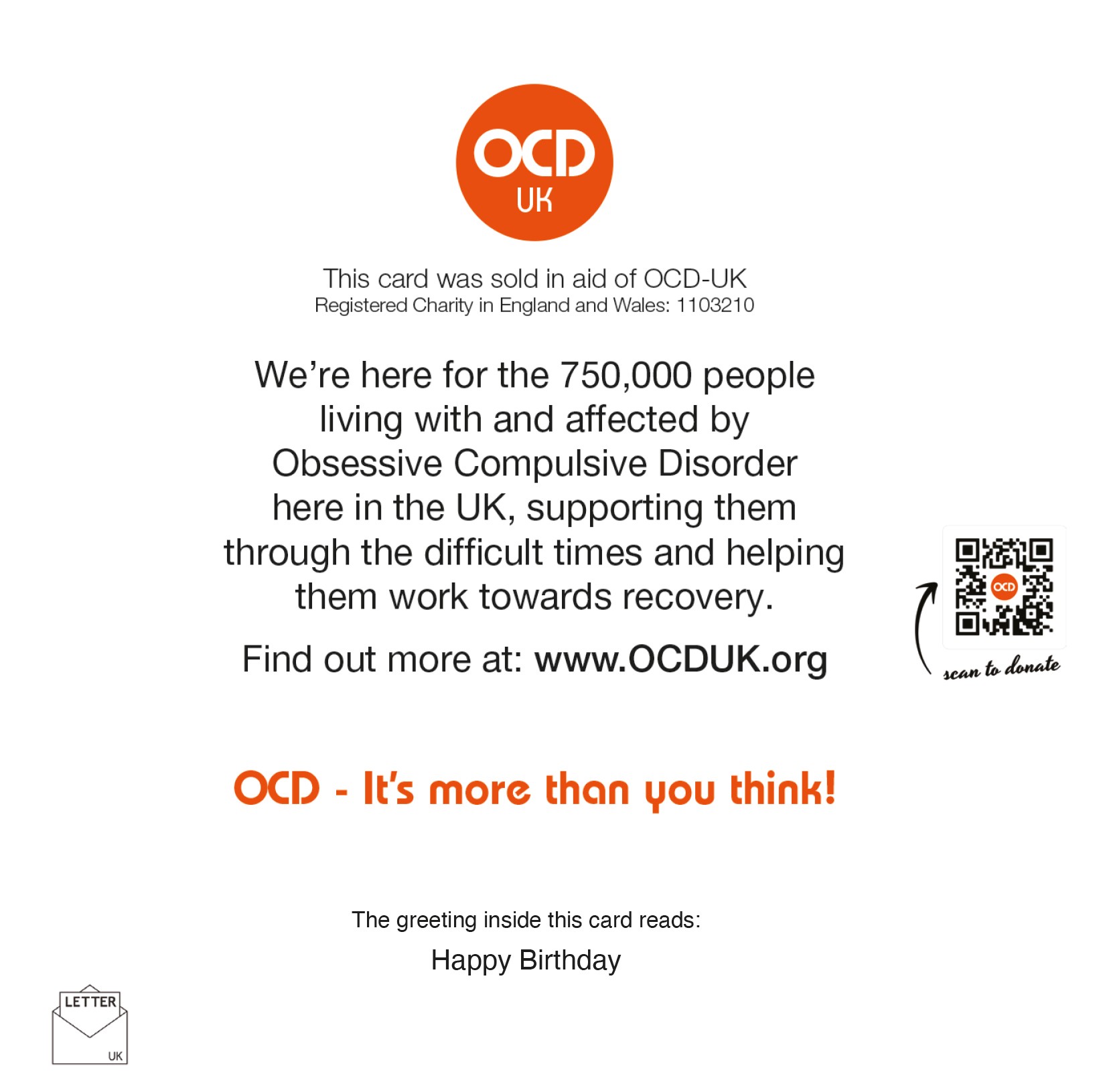 The back of the card carries a short message about OCD and the OCD-UK logo and donation QR code as pictured. The message reads: